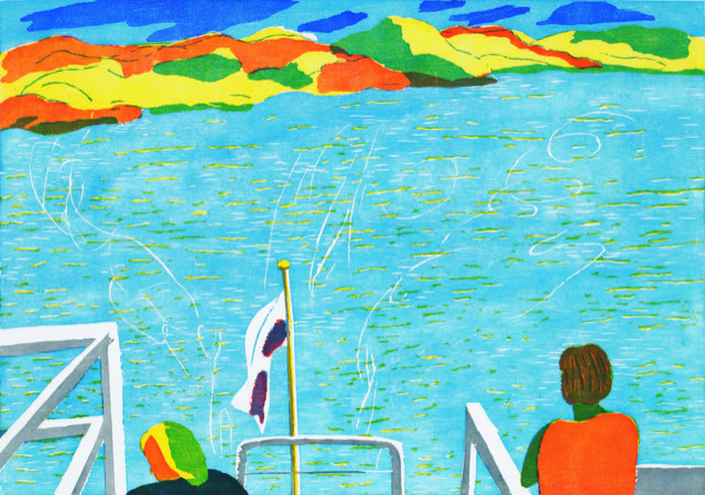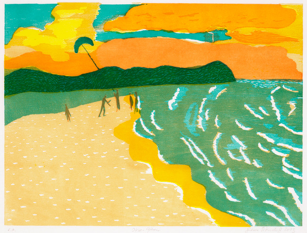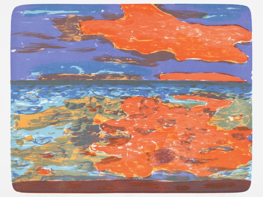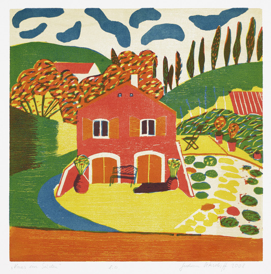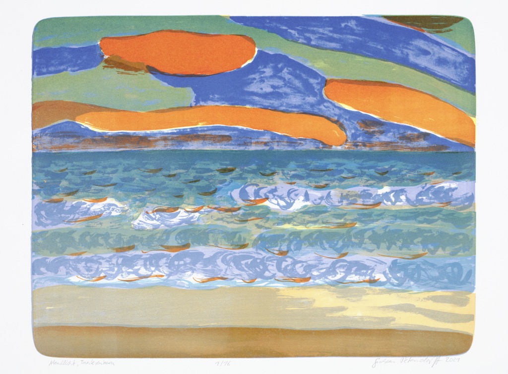 Kräftig und leuchtend deutet sie die Farben, überraschend forsch die Formen. Und immer gibt es eine gewagte, aufregende Irritation in der Zuweisung von Farbe und Form, um im ohnehin spektakulären Bildverlauf noch einen frivolen Höhepunkt zu setzen. Die Malerin weiß genau, mit welcher verwegenen Farbkombination sie Wärme, Tiefe, und Nähe erzeugen kann, wann die Farben schwingen, flirren, glühen, schlafen oder sich zu schmeichelndem Samt zusammenziehen, wie sich am Himmel südliches Licht von nördlichem unterscheidet (Haus in Sellin im Winter. 2020) und wann das Meer lila, grün oder die Wolken rot, die Berge violett und die Bäume in Orange strahlen müssen.