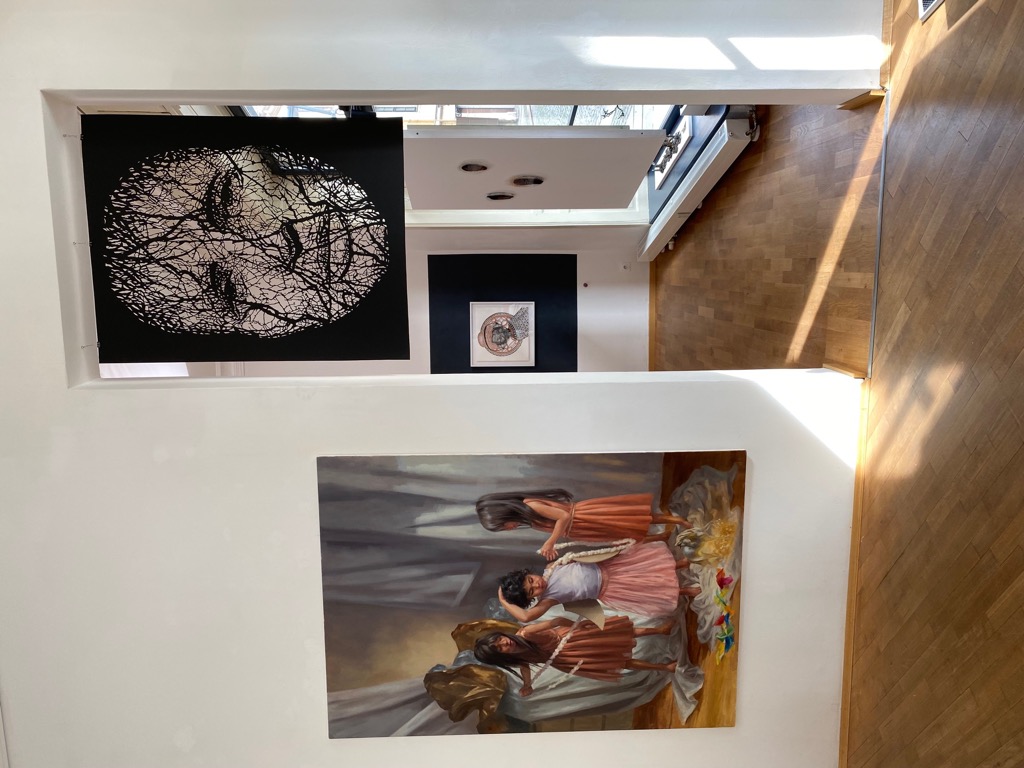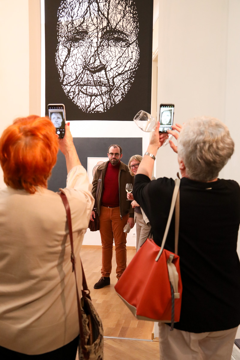 Leiser als laut – das klingt, als könnte man eine Wirkung steigern, indem man ihre Mittel reduziert. Man kann! Die leisen Töne können überraschend eindringlich sein und seltsam erhaben im Getöse der wilden Rufe. In diesem Sinn klar, unangefochten und souverän behaupten sich die Werke von Tina Wohlfarth auf dem Markt der Gegenwartskunst mit seinen Superlativen und Exzessen. Die Künstlerin agiert mit einer auffällig leisen Bescheidenheit. Der Cocon steht im Zentrum der neuen Werke: Ein großformatiges Mezzotinto, ergänzt mit Farb- und Metallpigmenten und anderem, eingefügt in aufwändigen Prägedruck und vollendet mit filigranen paper cut Passagen. Das Werk ist schlicht ein Universum, an dem die Künstlerin seit 2019 arbeitet. Und es ist ein Ereignis in seiner Kombination sehr alter aber hochgradig effektvoller – und seltener! - künstlerischer Techniken, die die Aufmerksamkeit des Betrachters sofort anziehen. Zunächst schlicht ein abgebildetes Hoodie ist Der Cocon die hochkomplexe Form eines Porträts ohne Gesicht. Im Ineinandergreifen divergenter Techniken ist die Stilistik moderner Darstellungsformen extrem erweitert. Auch die ergänzend gezeigten Arbeiten geben Einblick in die einmal mehr ins Extreme getriebenen künstlerischen Ausdrucksformen. Die präsentierten Werke der aktuellen Schau sind auch die Weiterführung der großen Werkgruppen Ophelia und human landscapes.